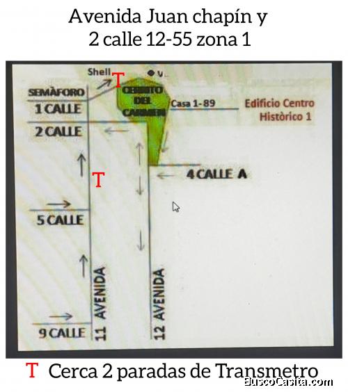 Alquiler apartamento en zona 1, edificio Histórico 1, cerca Cerrito del Carmen. En avenida Juan Chapín y 2 calle 12-55 zona 1. Llega por 11 avenida, ver mapa. Cerca de edificio Histórico 1 hay 2 paradas de Transmetro.