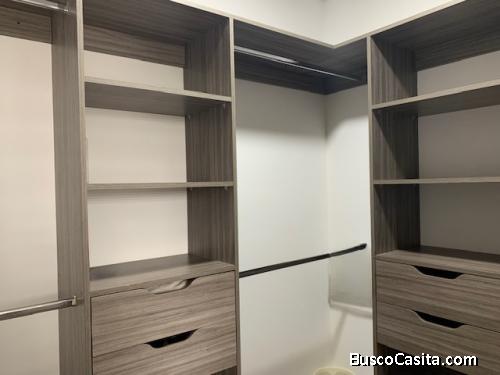 * Habitación principal con amplio walk in closet, baño privado y pequeño balcón, adicional área con closet en pared. Amueblada con cama matrimonial, 2 mesitas de noche, un pequeño mueble con gavetas y TV.