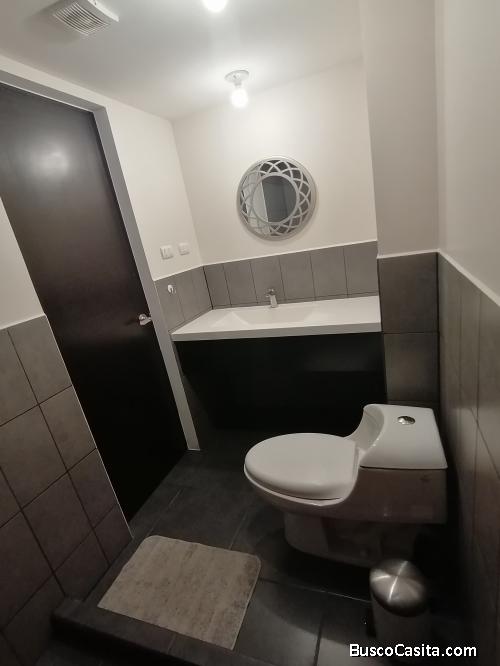 Sala, comedor, cocina equipada con gabinetes y área de lavandería. Habitación principal con closet y baño privado con tina, 2 habitaciones secundarias con closet y baño compartido con visitas.
