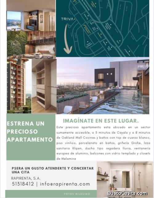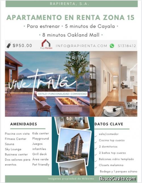 Apartamento para estrenar en edificio TRIVA zona 15, a 5 minutos de Cayala y 8 minutos de Oakland Mall, 2 dormitorios, 2 baños, sala, comedor, cocina, lavandería, bodega, parqueo, finos acabados y 12 amenidades, pet friendly. Ideal para familias, recien casados, estudiantes universitarios, ubicación inmejorable, cerca de universidades, colegios, centros comerciales,negocios, hospitales, clínicas, laboratorios. Comodidad, seguridad y accesibilidad en uno de los sectores más seguros y familiares de la ciudad, edificio con diseño, acabados y amenidades que ofrecen una excelente combinación entre naturaleza.