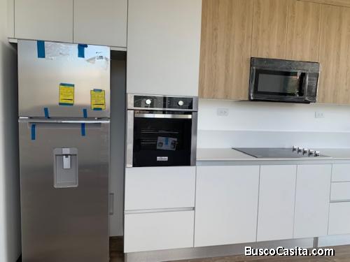 Apartamento de 1 habitación con amplio balcón y hermosa vista. Ambientes bien iluminados, finos acabados en madera, artefactos, cocina con gabinetes y top de Quarzo blanco, línea blanca en cocina y lavandería.