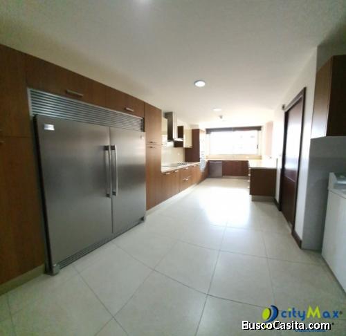 El apartamento tiene un área total de 343.5 m2 distribuidos en 3 amplias y cómodas habitaciones, 3.5 baños, 5 parqueos, 1 bodega.