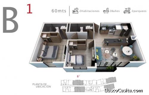 apartamento con 2 habitaciones mas 1 tipo flex (sala familiar o habitacion), en niveles 2, 4 o 5.