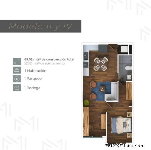 El Apartamento cuenta con: 68.5Mts2 totales, 1 Habitacion, 1 Baño, area de estudio, area de lavanderia,1 Parqueo, Bodega. Este apartamento Se entrega con gabinetes de cocina, closets y muebles de baño