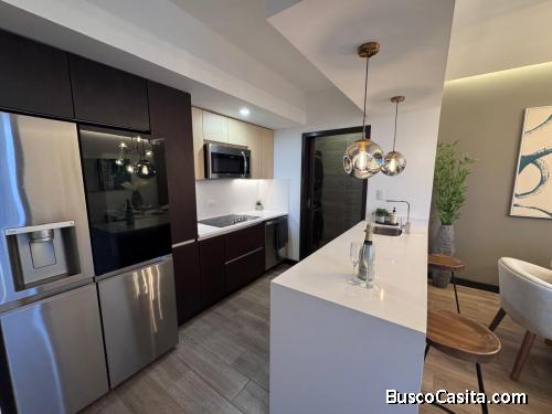 Los apartamentos cuentan con acabados de alto nivel, pisos laminados, cocinas con top de cuarzo, gabinetes modernos, closets y baños elegantes. Su diseño incluye 2.60 m de altura, cielo falso, muros sólidos, iluminación tipo ojos de buey, ventanería europea y balcones con vidrio templado que aportan estilo y funcionalidad.