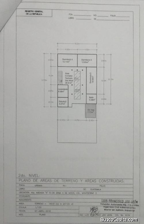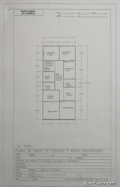 Casa de 9.10 * 20.00 mts, primer nivel, sala, comedor, cocina pequeña, garaje para dos carros compactos, baño, tres habitaciones, gradas con área de almacenaje, patio, segundo nivel, sala familiar pequeña, tres dormitorios, un baño, lavandería, bodega y patio, todos sus servicios al día, recién pintada