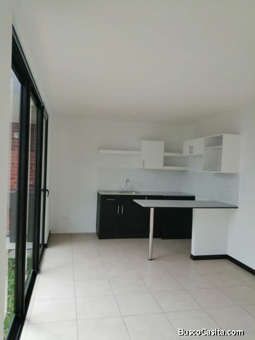 Parqueo para 2 vehículos, Sala, Comedor - Cocina, Jardín lateral con área de lavandería, Baño completo, pequeña bodega.