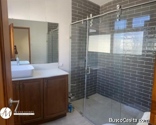 Cuenta con aproximadamente 100mts2, sala, comedor, cocina, área de lavanderia, área de servicio, 2 dormitorios, dormitorio secundario con baño y dormitorio principal con baño y walking closet, sala familiar.