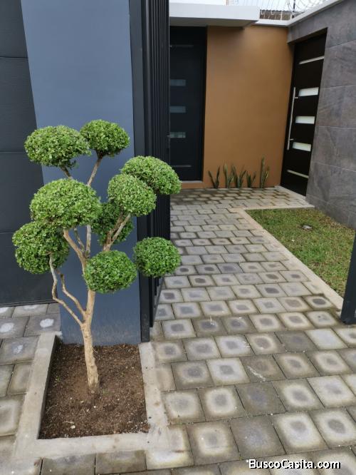 Sala-comedor integrados en espacio abierto tipo américano, cocina con gabinetes encimeras de granito, baño de visitas, patio y amplio jardín, área de lavandería, dos bodegas, cuarto de estudio, portón eléctrico, parqueo techado para tres vehículos, razor ribbon para mayor seguridad y tranquilidad, instalación para aire acondicionado, piso ceramico