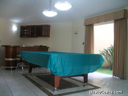 Hermosa casa amueblada en venta dentro de exclusivo condominio en San Lucas Sacatepéquez. Área construida 600.00 m2. Área de terreno 766 m2. Medida Frente 20.00 m. Medida Fondo 38.28 m Cuenta con tres construcciones dentro de la propiedad, Casa Principal de dos niveles con cuatro habitaciones, sala, comedor, cocina con gabinetes de lujo con top de Cuarzo, sala de juegos con bar, estudio, cuarto de servicio, jardín, cuatro y medio baños, finos accesorio de baño marca Kholer, azulejos españoles, jacuzzi , parqueo para ocho vehículos. Apartamento dos habitaciones, sala, cocina y área de jardín. Apartamento para seguridad de dos niveles, cuenta con dos ambientes de habitación para cuatro personas, cocineta terraza, ventana de control, ocho cámaras de seguridad y bodega, instalación lista para conectar planta eléctrica. PMC-009-06-15