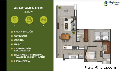 El Apartamento en Venta, 70 mt2 contara con: Sala + balcón + comedor + cocina + baño + 2 habitaciones secundarias + habitación principal + walk in closet + baño + balcón + área de lavandería.