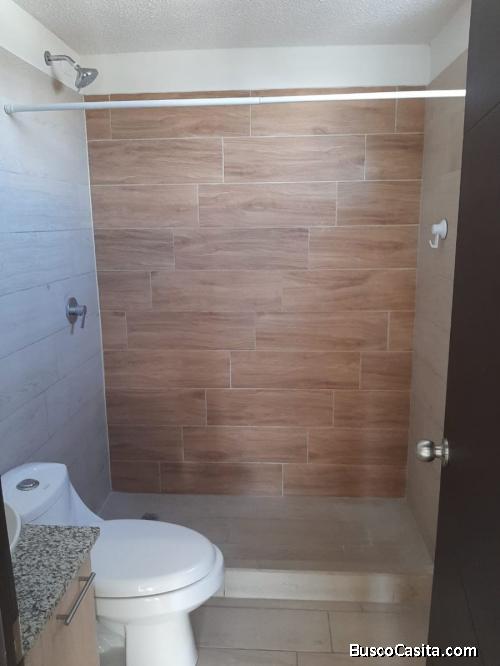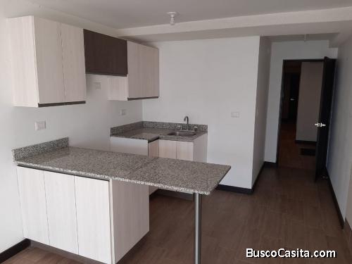 El apartamento cuenta con una habitación, sala y comedor, cocina con gabinetes, baño completo, y baño de visitas.