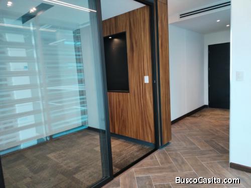 Alquilo Oficina de esquina con vista panorámica al sur, diseño cuadrado, iluminación natural, puerta principal amplia con acabados de madera, piso cerámico, ventanas de piso a techo, 4 ventanas abatibles para mayor ventilación, Rollers en las ventanas, diseño moderno en el exterior de la oficina, cocina, baños.