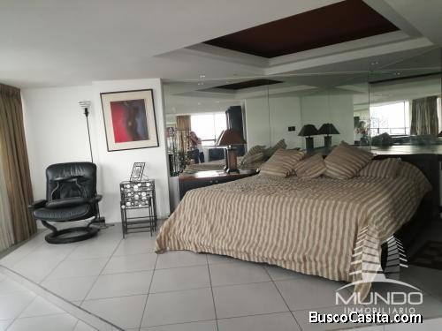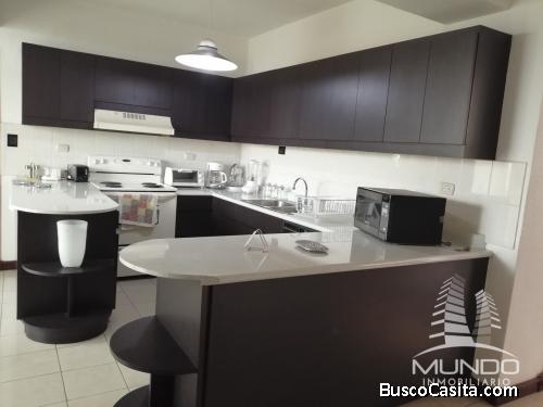 Penthouse amueblado de dos niveles, dormitorio principal con baño, walking closet y jacuzzi dos dormitorios secundarios con baño completo y jettina, pisos y zócalos de madera, sala con chimenea, comedor, bar, cocina con pantry ,sala familiar. Baño de visitas, dormitorio de servicio con baño, alacena, lavandería completa, calentador general, balcón con jardín, rodea el primer nivel del apartamento, agradable vista a la ciudad y los volcanes .