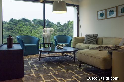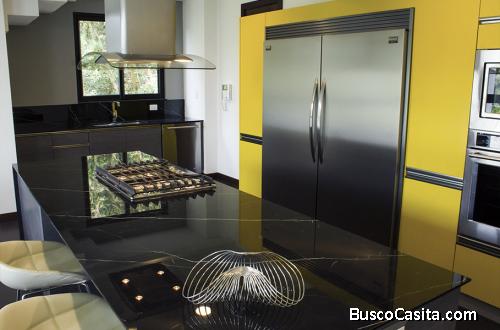 El ingreso principal cuenta con elegante lobby, estudio , acceso a tres parquéos, dependencia de servicio,y área techada de lavandería, bodega. Los interiores son muy amplios con doble altura en las salas y deck exterior con vista a la ciudad, los acabados con pisos franceses lamett en todas las áreas, incluyendo cocina y pantry, grifería fina y las mejores cerámicas nacionales fabricadas por Samboro.