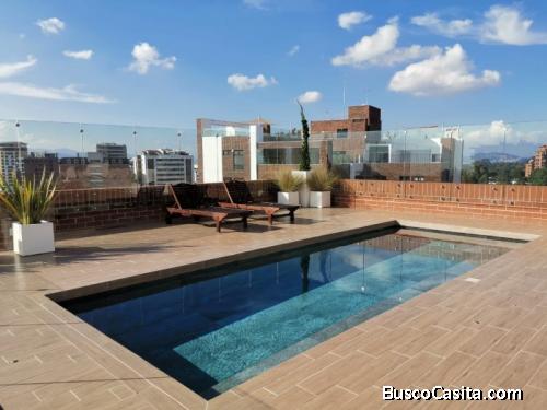 El apartamento tiene 108.64 mt2 de área habitable, 24.95 mt2 de 2 espacios de parqueo tipo tandem = 133.59 mt2 totales.