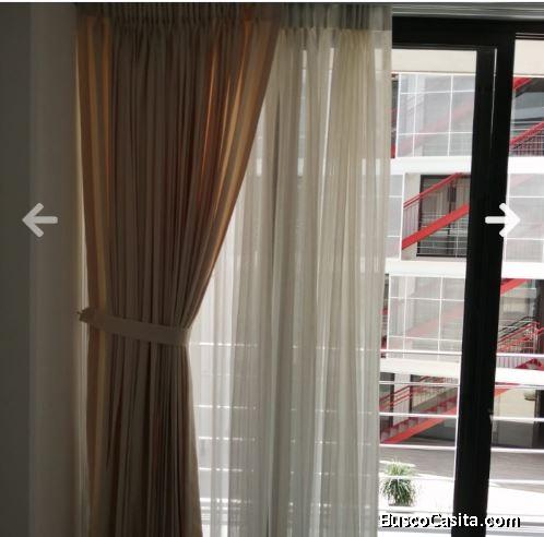 Totalmente equipado (Refri26, torre lavado/secado, cooktop, extractor, microondas, calentador de agua), con cortinas e iluminación (lámparas)